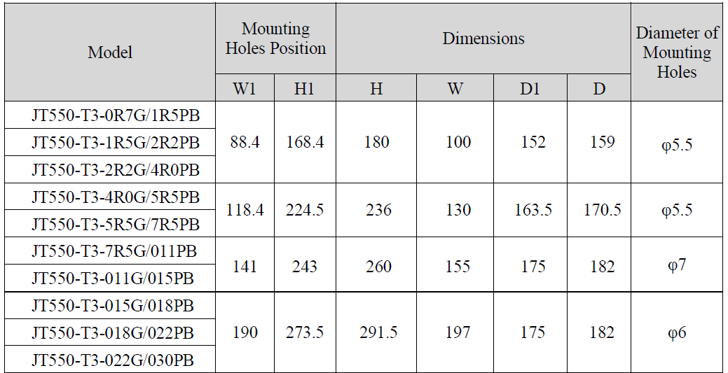 Kích thước lắp đặt biến tần Juditech JT550-T3-2R2: