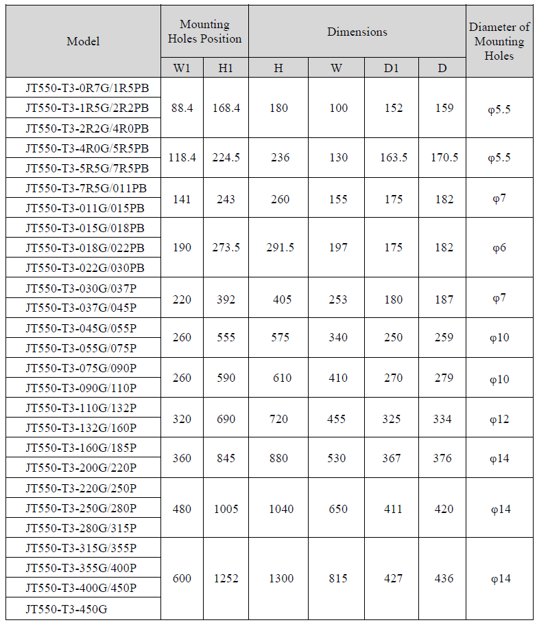 Kích thước lắp đặt biến tần Juditech JT550-T3-2R2: